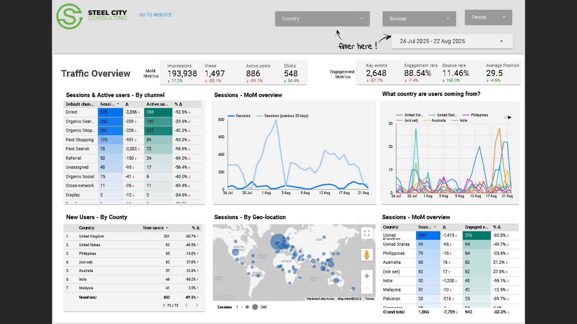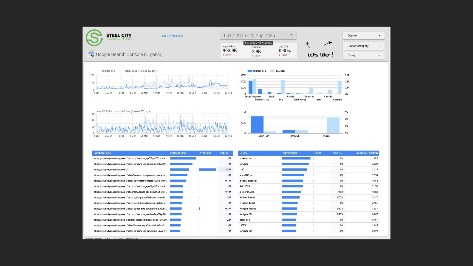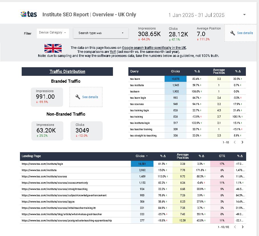 Designed and built automated performance dashboards in Looker Studio for Tes Institute and Steel City Consulting, integrating Google Search Console and other data sources to surface actionable insights. These tools enabled senior stakeholders to make faster, more informed decisions by visualising key performance metrics including search visibility, click-through rates, and conversion-driving content.